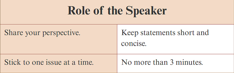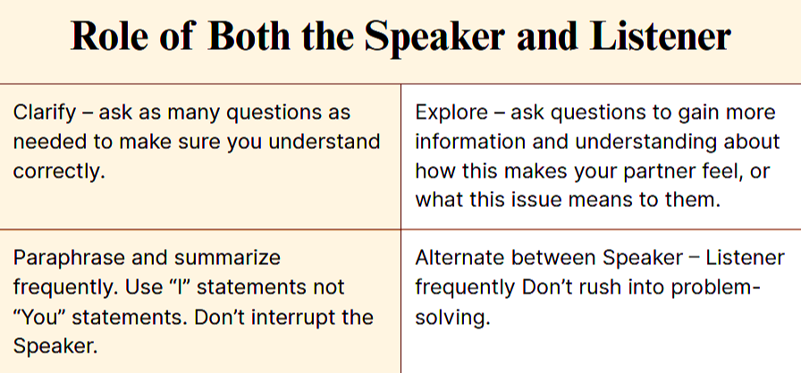 With each response, repeat the speaker-listener steps until that topic is understood or needing to be revisited at another time.